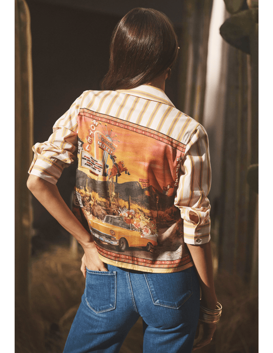 L'AGENCE Cosette Cropped High Low Blouse in Black Gold Stripe