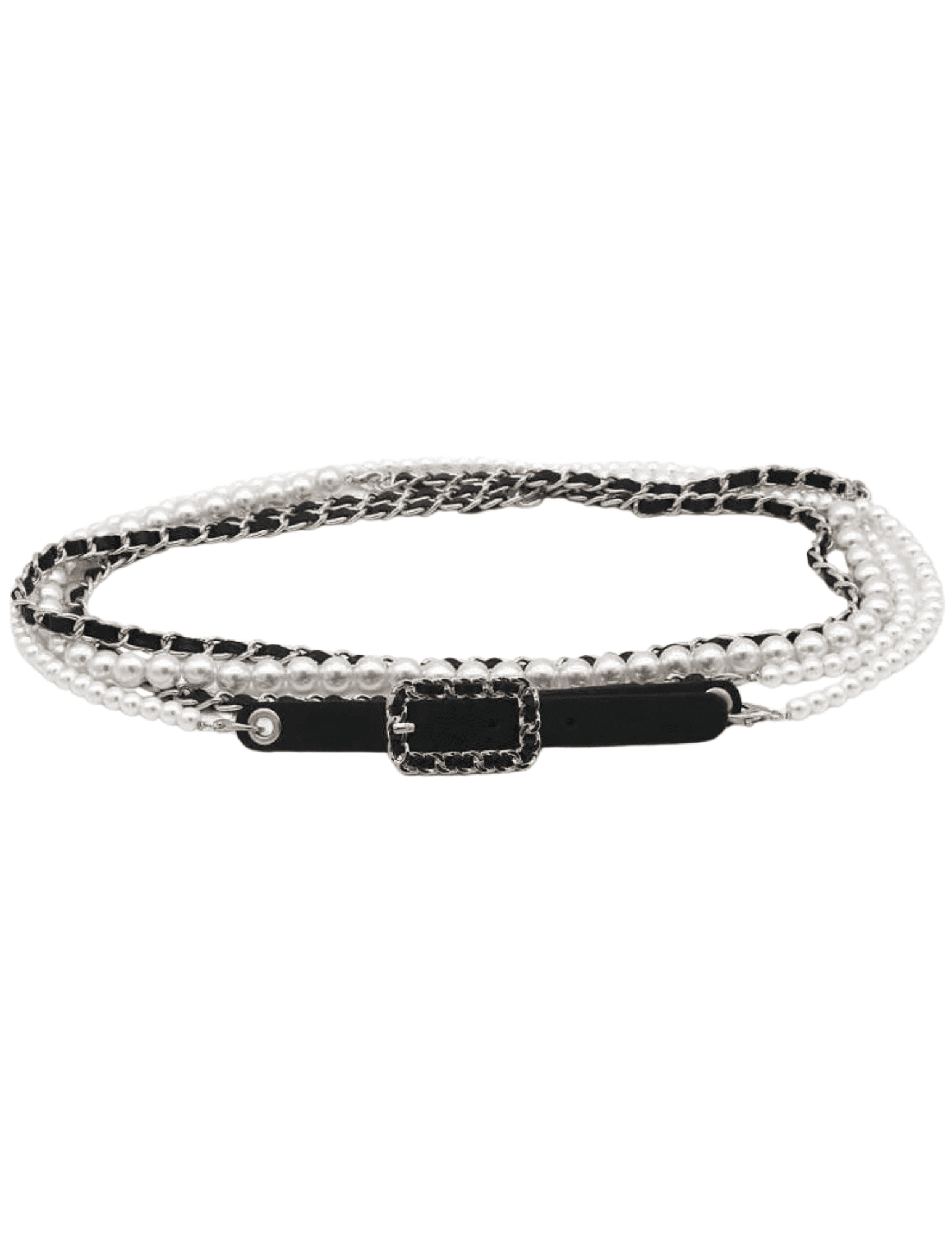 Elevate your look with the Fleur de Camélia Caity Pearl Chain Wrap Belt, a statement accessory blending modern elegance with vintage-inspired glamour. This belt features intertwined black faux leather and silver-tone chains, accented with pearl-inspired bead strands for a touch of timeless sophistication.
