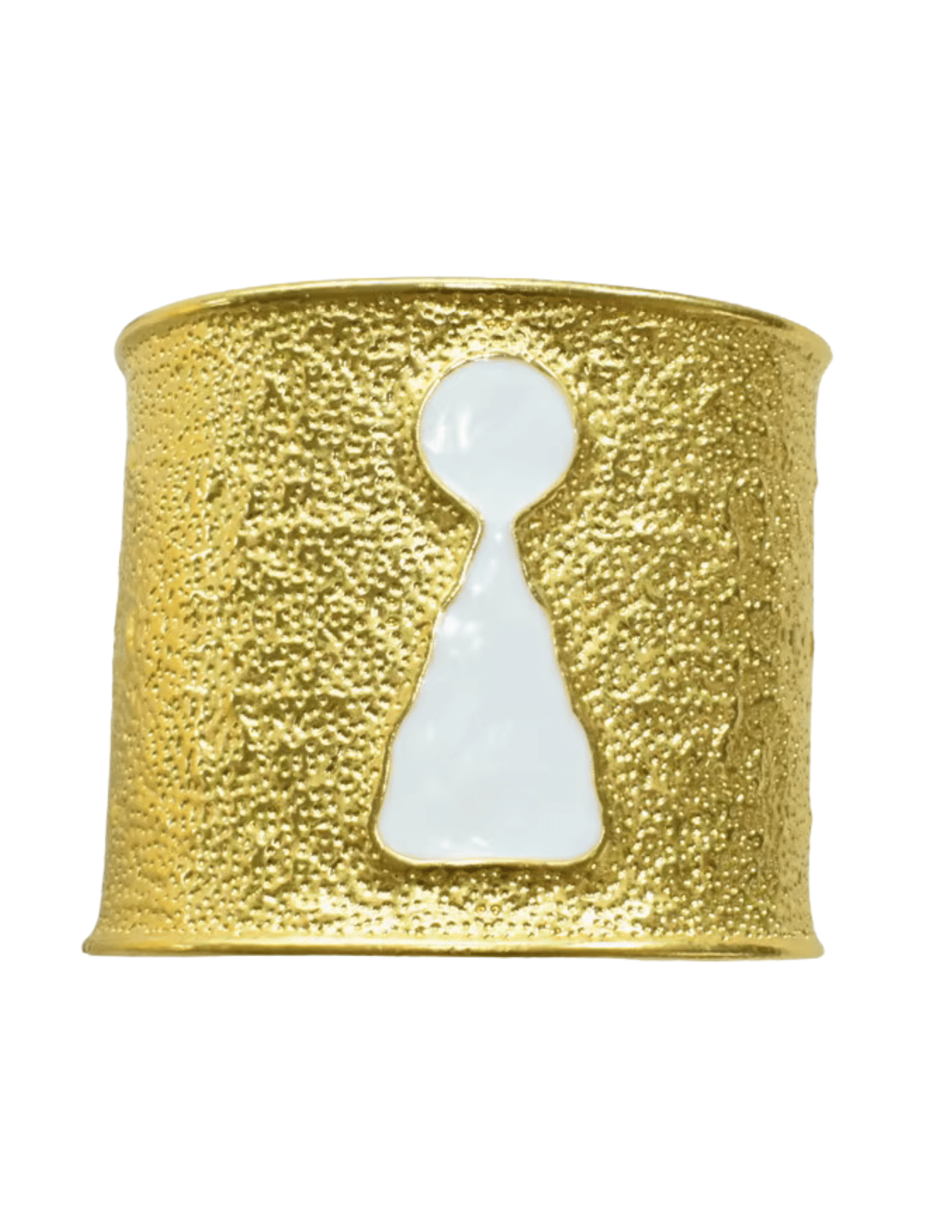 Make a bold style statement with the Fleur de Camélia Keyla Abstract Cuff Bracelet, a striking sculptural accessory crafted in richly textured gold-tone metal. This wide open cuff features a dramatic white resin keyhole design, creating a modern contrast that instantly elevates any look.