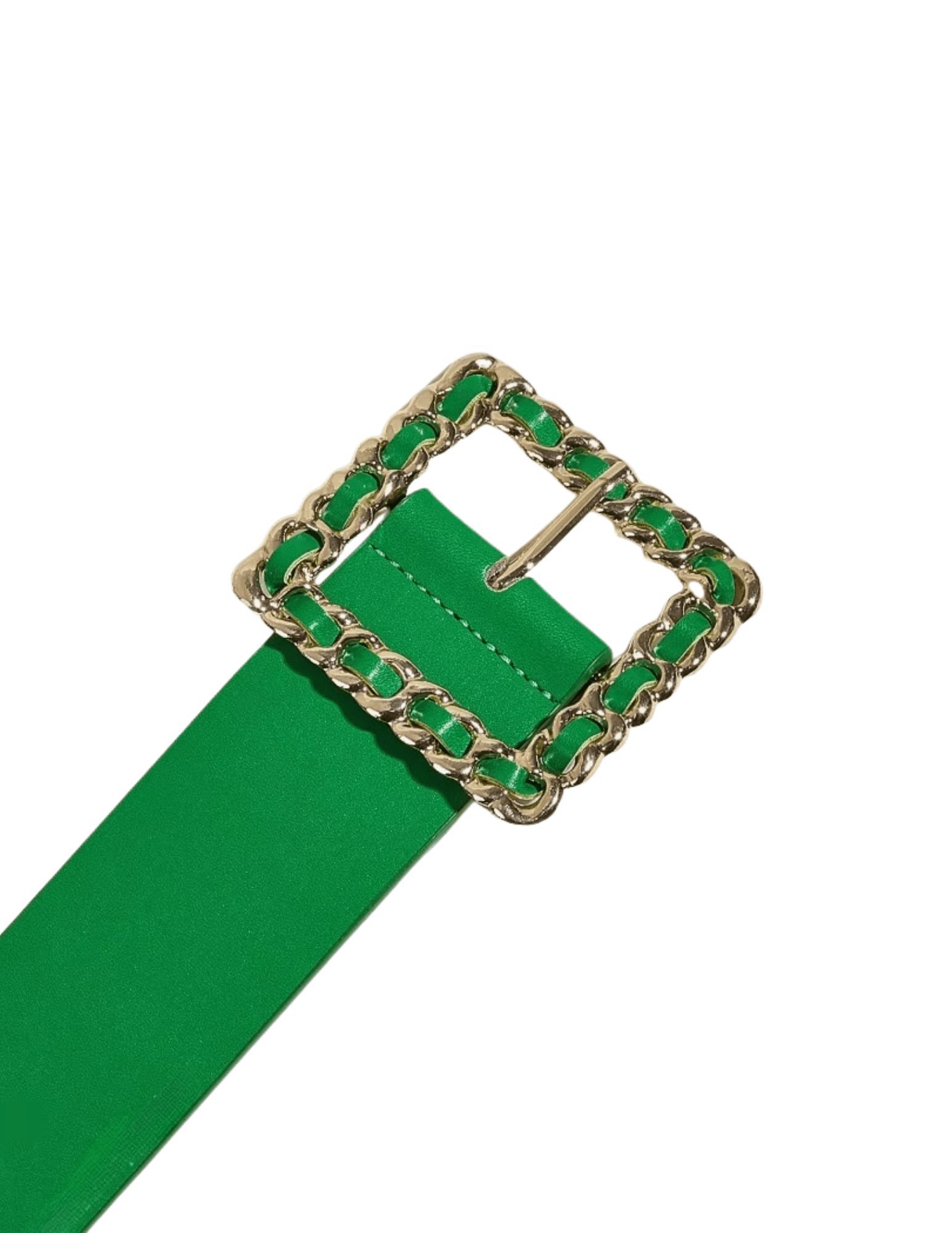 Elevate everyday styling with the Fleur de Camélia Shelia Chain Buckle Belt, crafted in a Bright Green vegan leather that pairs effortlessly with denim, trousers, dresses, and outerwear. Designed to bring polished sophistication to any outfit, this belt features a striking square gold-tone chain-style buckle that adds texture, shine, and a luxe finish.
