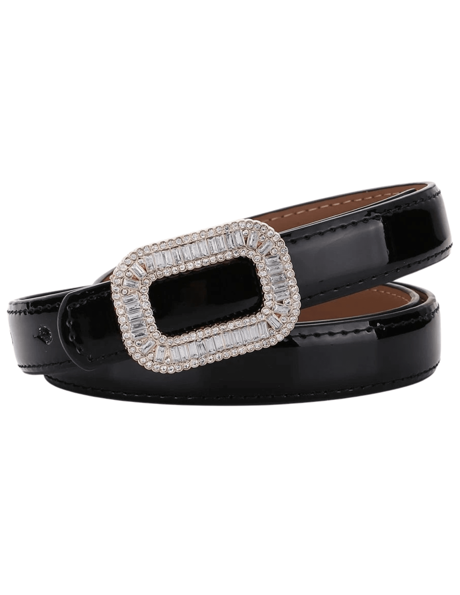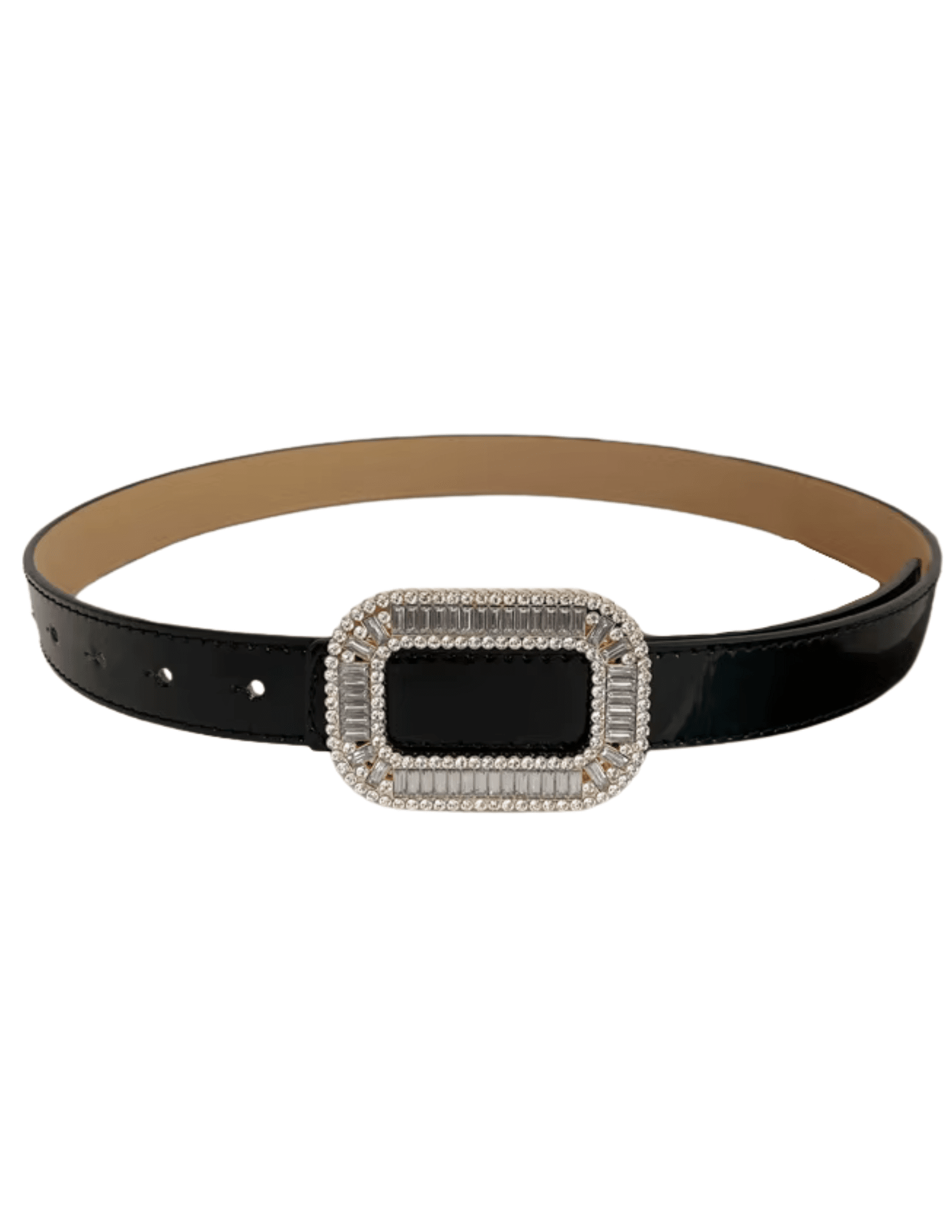 The centerpiece is an squoval buckle adorned with shimmering baguette rhinestones, set in goldtone metal for a luxe, vintage-inspired look. Its lustrous leather strap offers a soft, sumptuous texture while providing a comfortable fit. Whether paired with tailored trousers, a sleek dress, or high-rise denim, this belt is the perfect way to define your waist and add refined glamour.