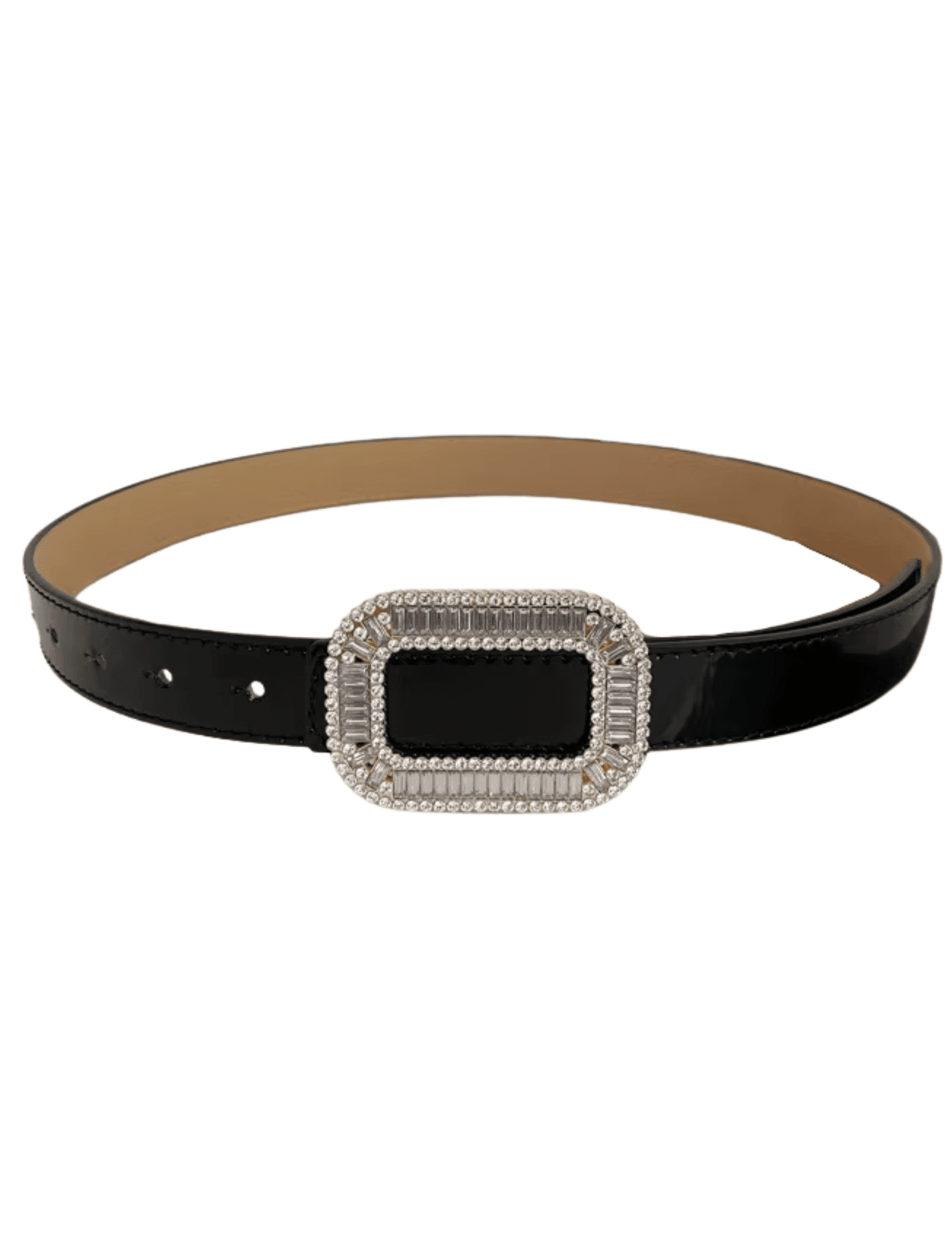 The centerpiece is an squoval buckle adorned with shimmering baguette rhinestones, set in gold-tone metal for a luxe, vintage-inspired look. Its lustrous leather strap offers a soft, sumptuous texture while providing a comfortable fit. Whether paired with tailored trousers, a sleek dress, or high-rise denim, this belt is the perfect way to define your waist and add refined glamour.