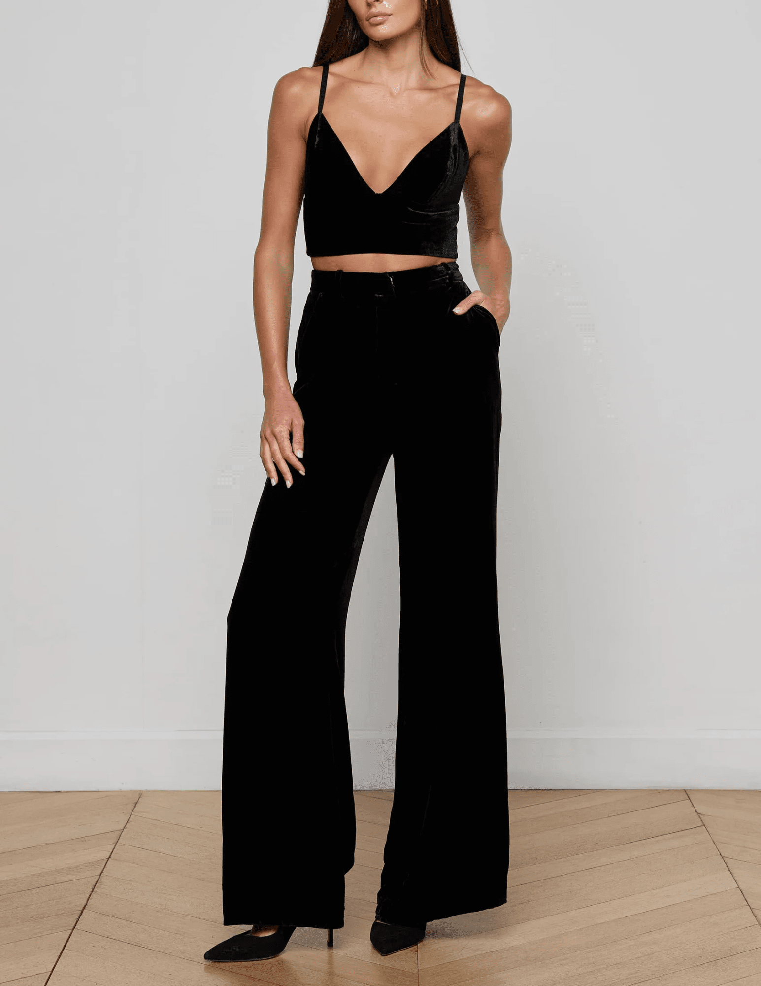 The L’AGENCE Aislin Velvet Bralette Top in Black combines modern sensuality with luxurious texture. Crafted from silk-infused velvet, this bralette features a longline silhouette for a flattering fit. The adjustable spaghetti straps and back hook-and-eye closures allow for a personalized feel, while the lustrous velvet finish adds sophistication to layering or statement looks.