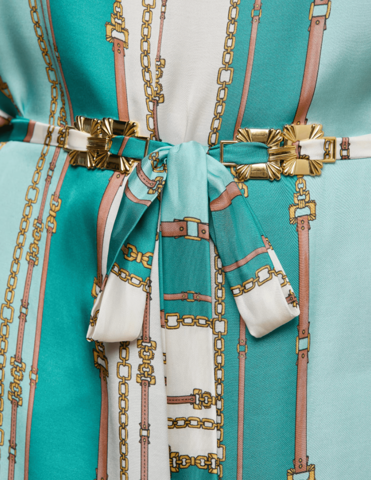 Elevate your resort wardrobe with the L’AGENCE Alia Cover-Up Tunic in Light Sage Belt Stripe, a breezy statement piece designed for effortless luxury. This relaxed tunic silhouette drapes beautifully over the body, offering chic coverage from the pool to the beachside dinner. Its soft boat neckline, eye-catching belt-stripe print, and removable gold deco chain belt add balance, polish, and a touch of glamour to warm-weather styling.