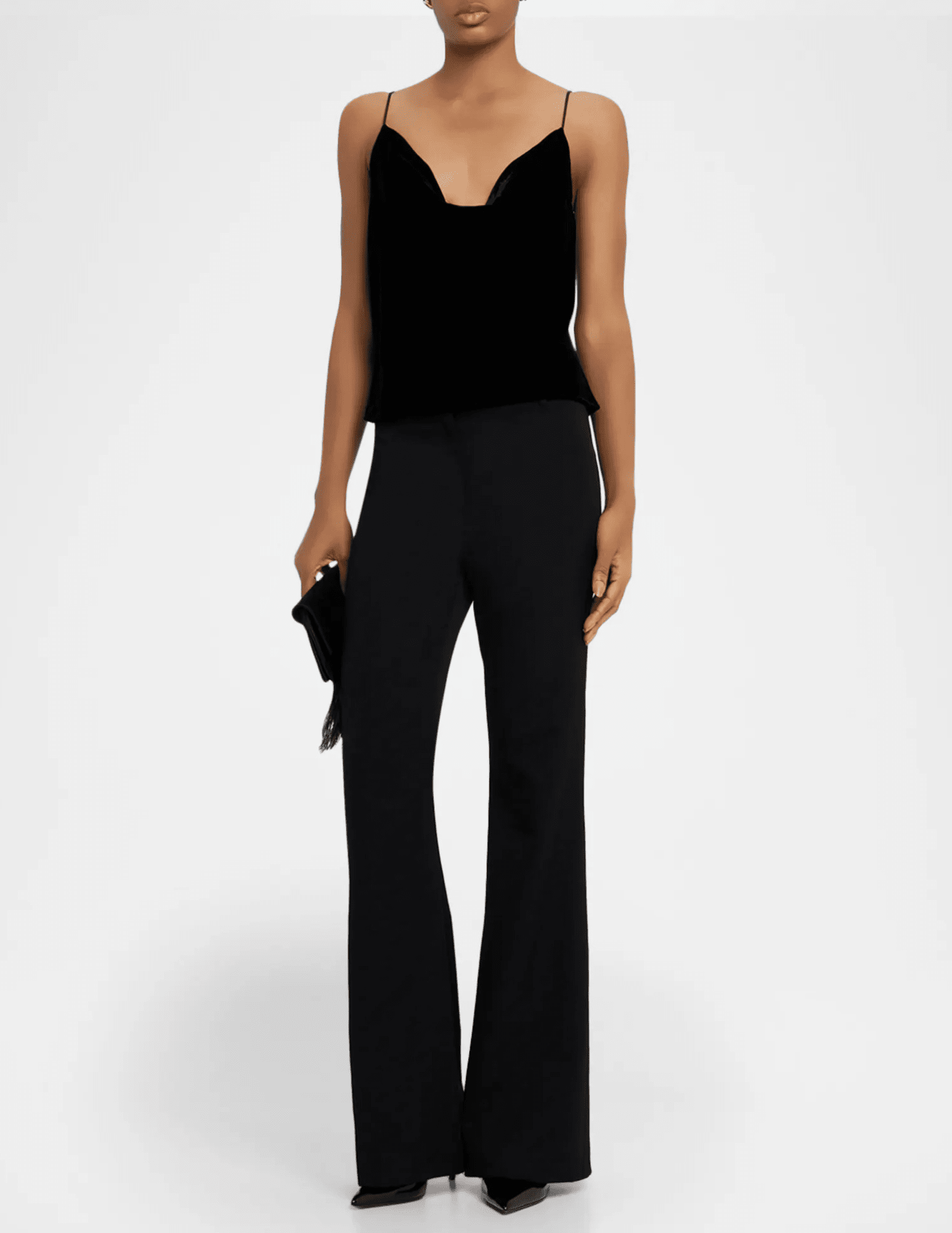 The L’AGENCE Calista Velvet Cowl Neck Cami in black exudes quiet luxury with a sensual, sculpted drape. Crafted from a silky viscose-blend velvet, it features a weighted cowl neckline that flatters the décolletage, while the bias-cut silhouette offers a fluid, body-skimming fit.