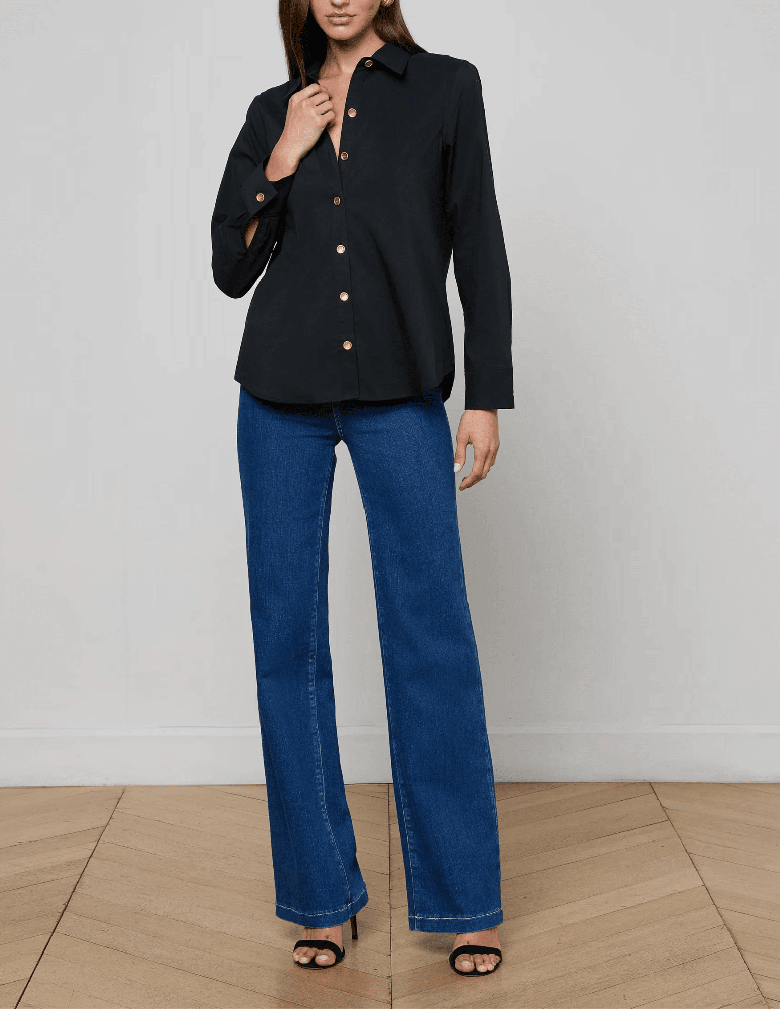 The L’AGENCE Ellery Long Sleeve Button Blouse in Black Gold is a modern essential with timeless sophistication. Designed in stretch cotton poplin for a crisp, tailored look, this blouse features gold dome embossed buttons that elevate the classic shirting silhouette with subtle luxury.