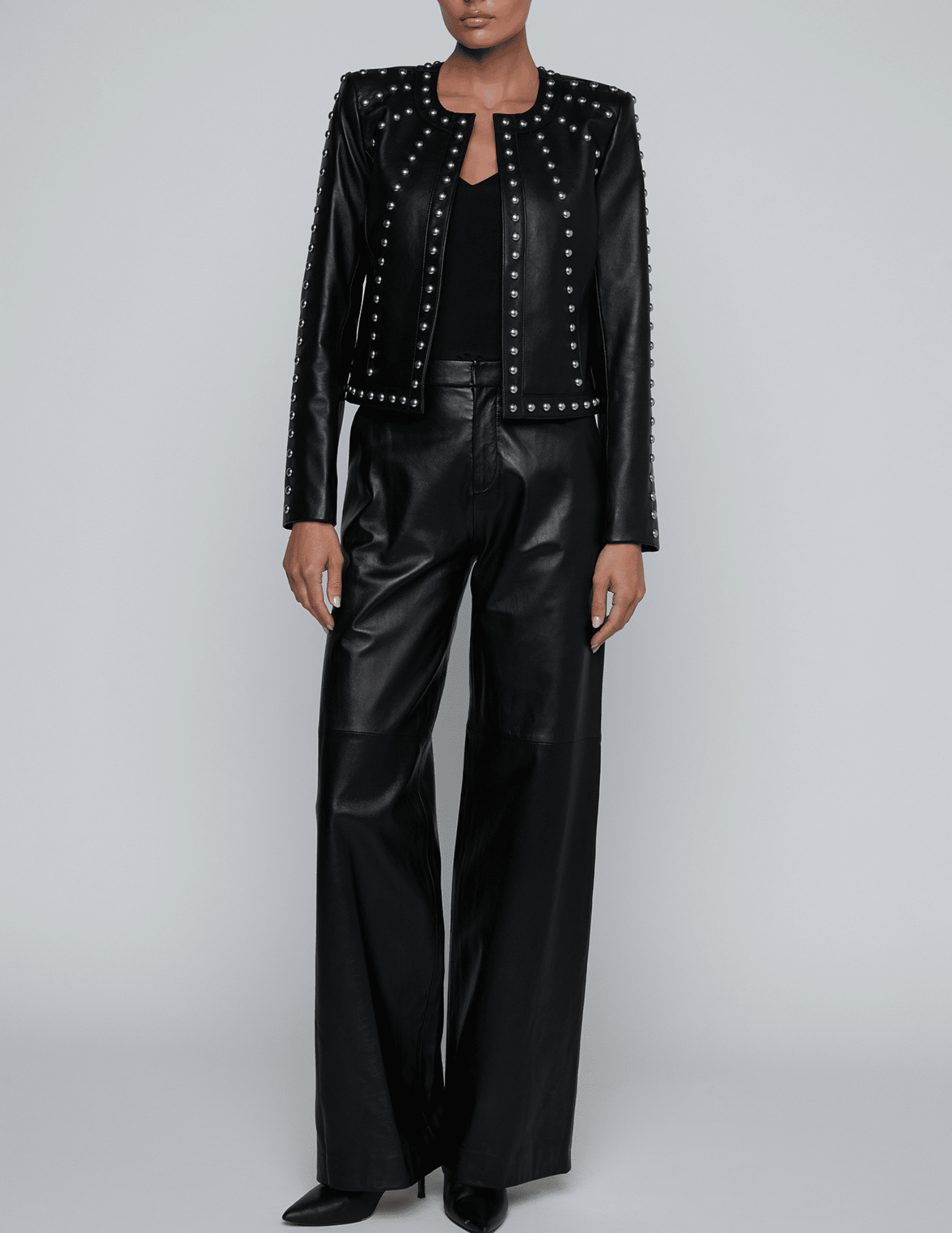 The L’AGENCE Fia Studded Collarless Leather Jacket reimagines the classic moto edge with elevated sophistication. Crafted in 100% lambskin leather, this bold silhouette features a sleek, boxy fit accented by silver-tone stud detailing across the collar, placket, and sleeves. Designed without closures, the open-front style makes it the ultimate statement layering piece for both day and night.