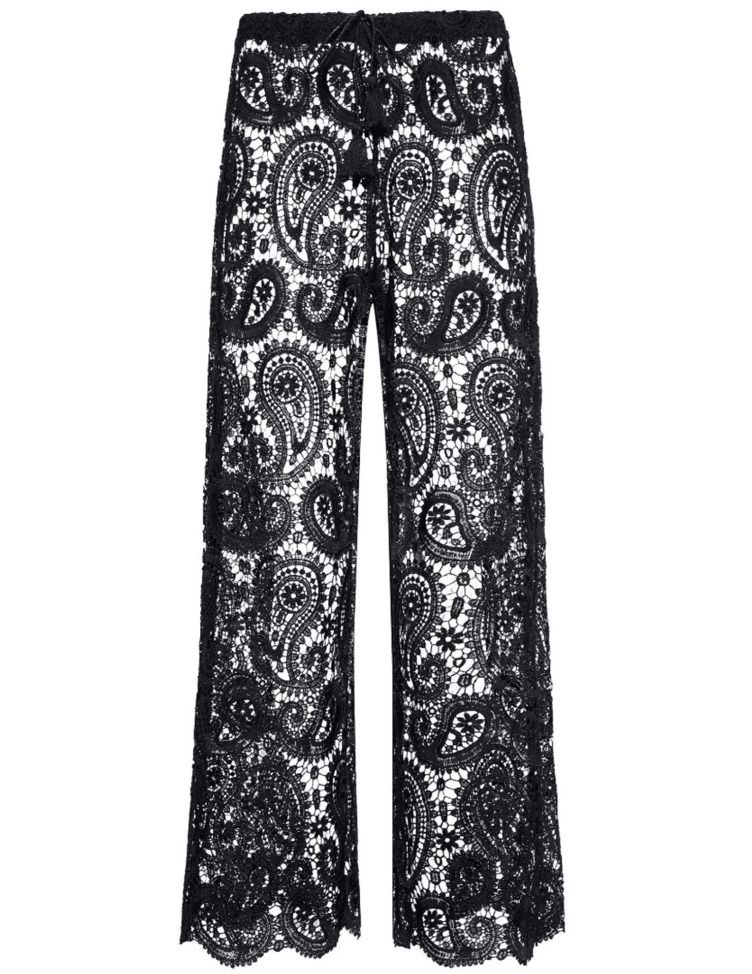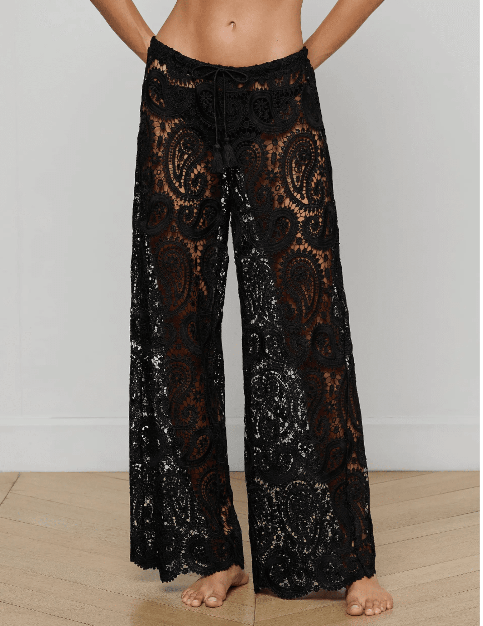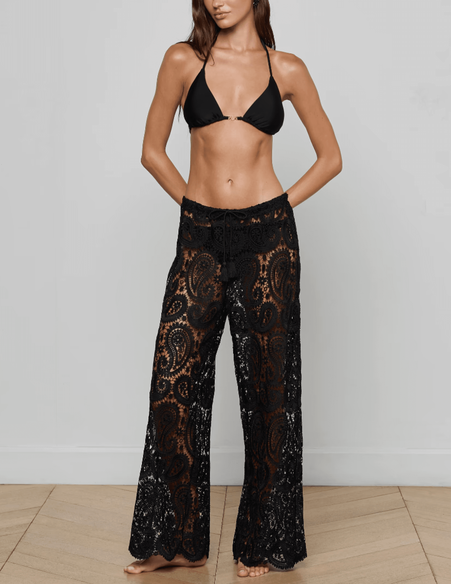 The wide-leg cut creates fluid movement with every step, while the mid-rise elastic waistband with adjustable drawstring ensures a comfortable, personalized fit. Scalloped hems add a soft, romantic finish that elevates the crochet texture. Designed for versatility, the Geraldine pant pairs beautifully with bikinis, one-piece swimsuits, matching crochet tops, bandeaus, or lightweight resort blouses.