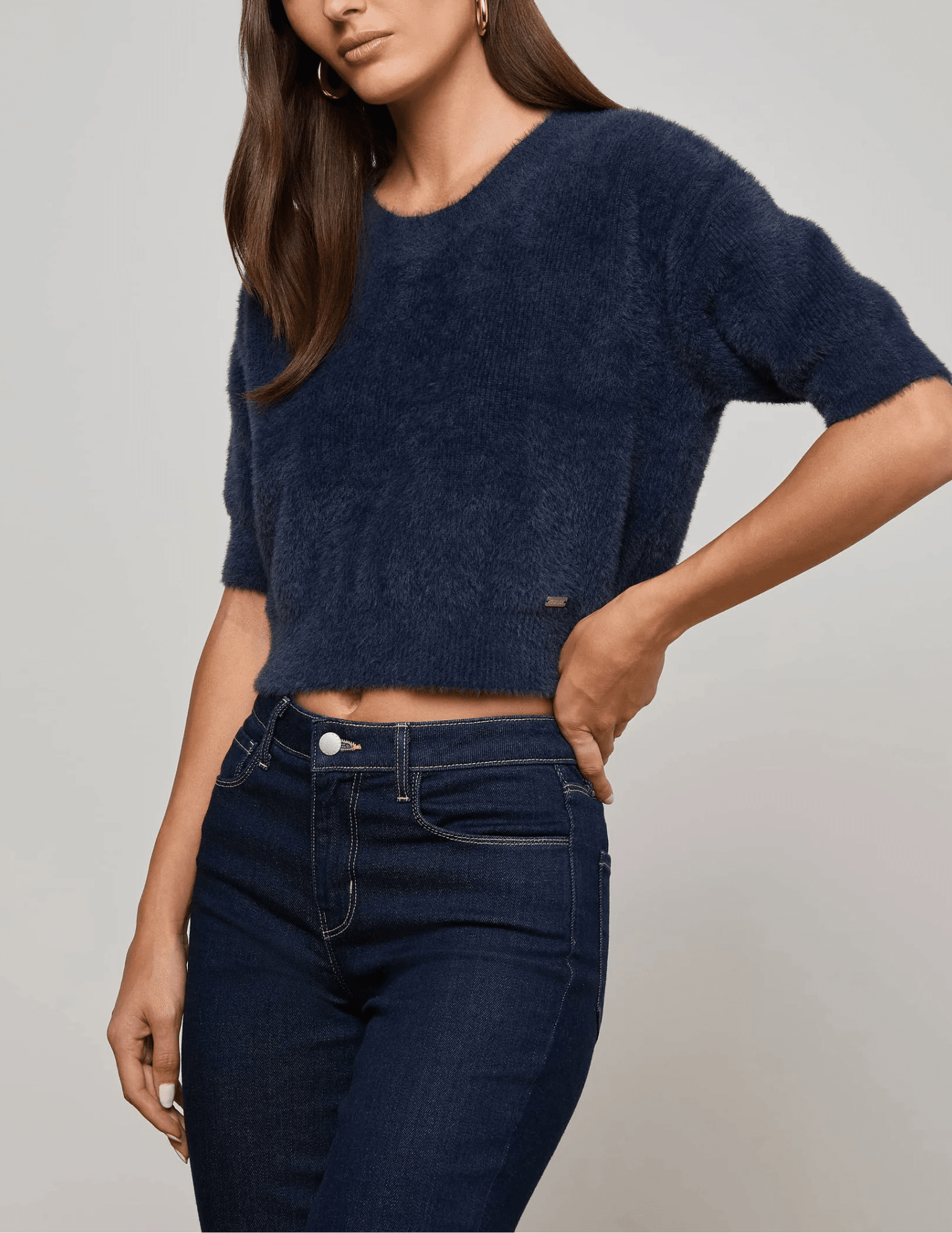 The L’AGENCE Guinevere Short Sleeve Crop Sweater in Midnight reimagines a classic pullover with a modern twist. Designed with a cropped hem and short sleeves, this ultra-soft knit adds a contemporary edge to casual dressing. Plush in texture yet lightweight, it’s an easy layering piece that transitions seamlessly from day to night.