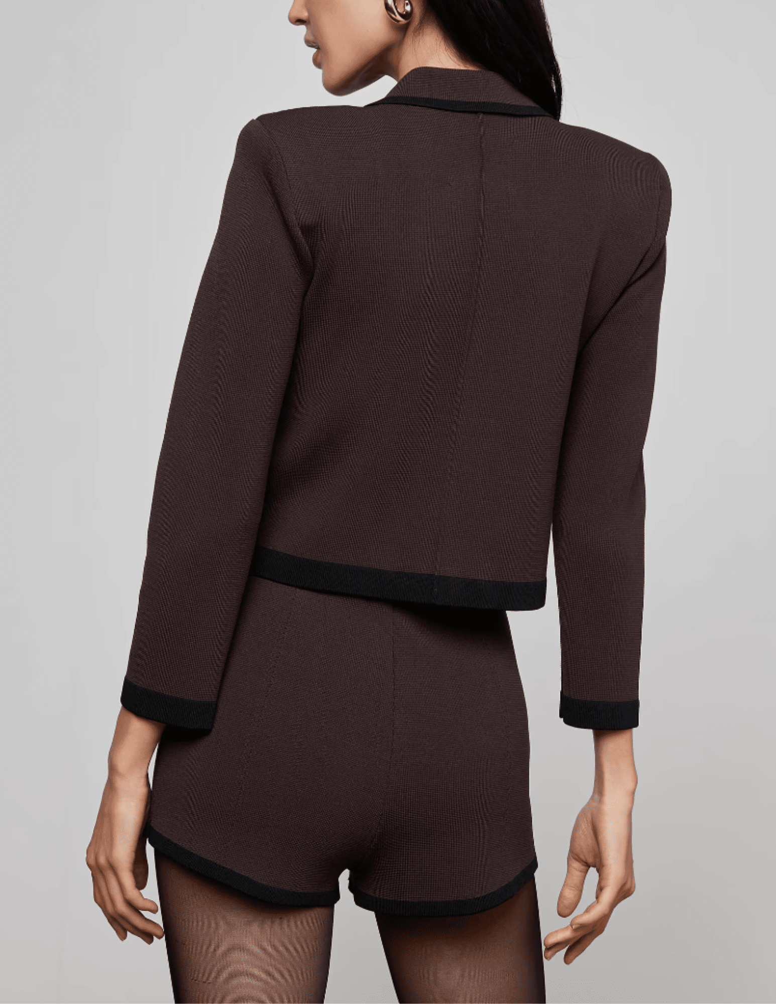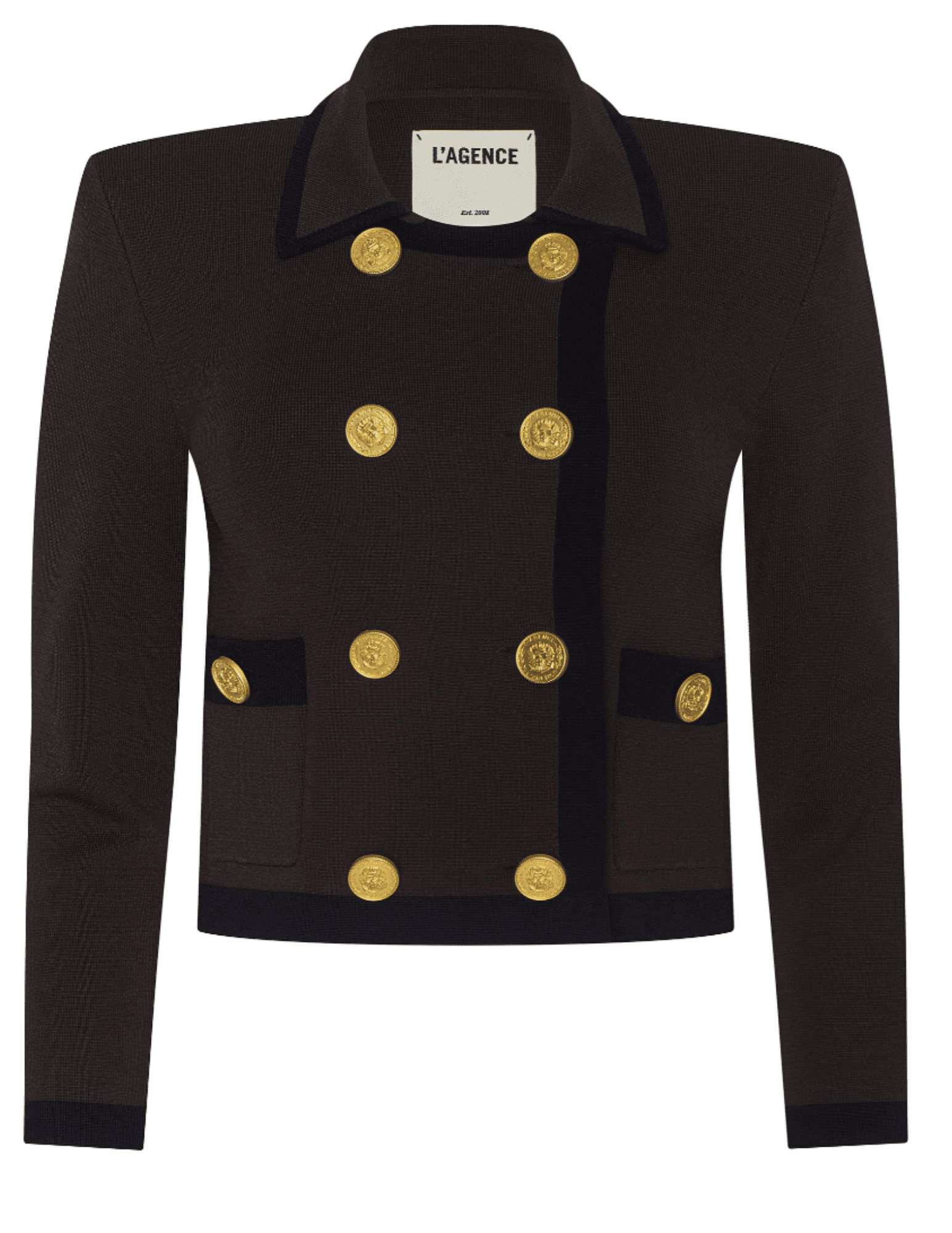 The L’AGENCE Janu Contrast Trim Knit Jacket delivers polished structure with effortless wearability. Designed in a rich dark brown knit with black contrast trim, this cropped jacket blends classic tailoring with modern knit construction for a refined yet comfortable fit.