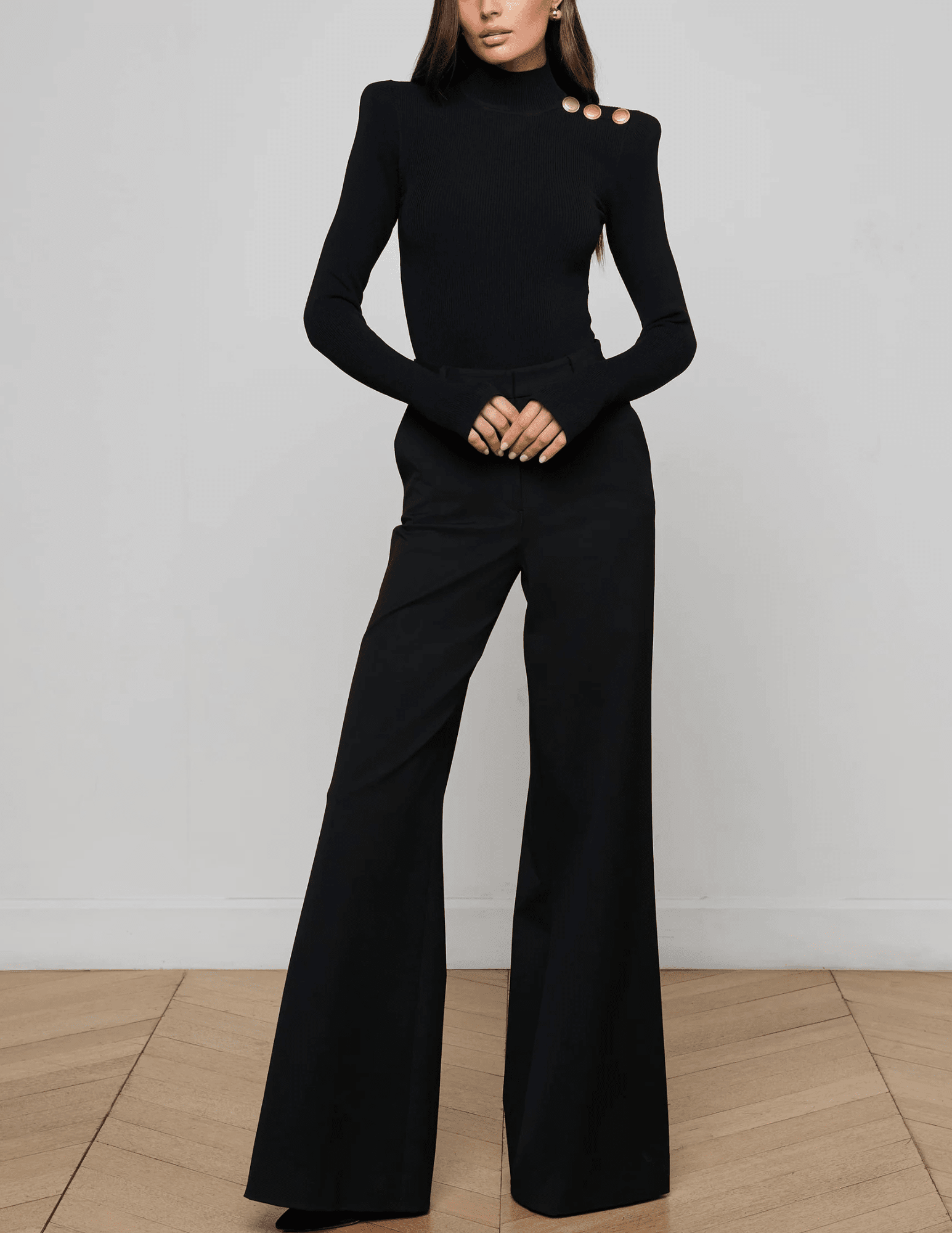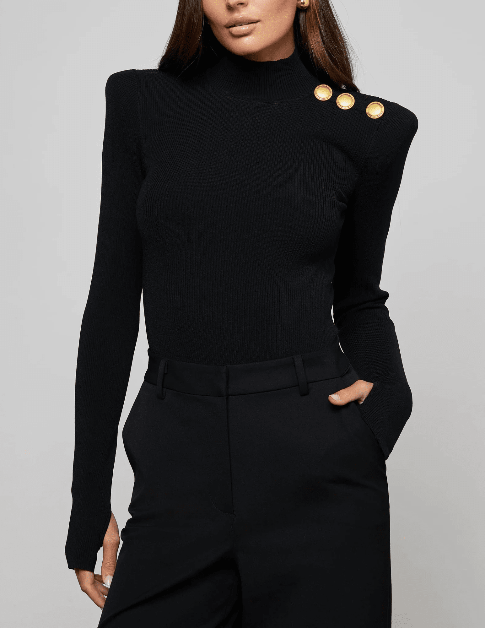 The Jennis Bodysuit from L’AGENCE offers a sculpted, powerful silhouette that redefines elevated essentials. Crafted in a stretch power knit, this sleek long-sleeve bodysuit features a structured mock neckline, defined shoulders with subtle padding, and gold decorative buttons for a refined military-inspired touch.