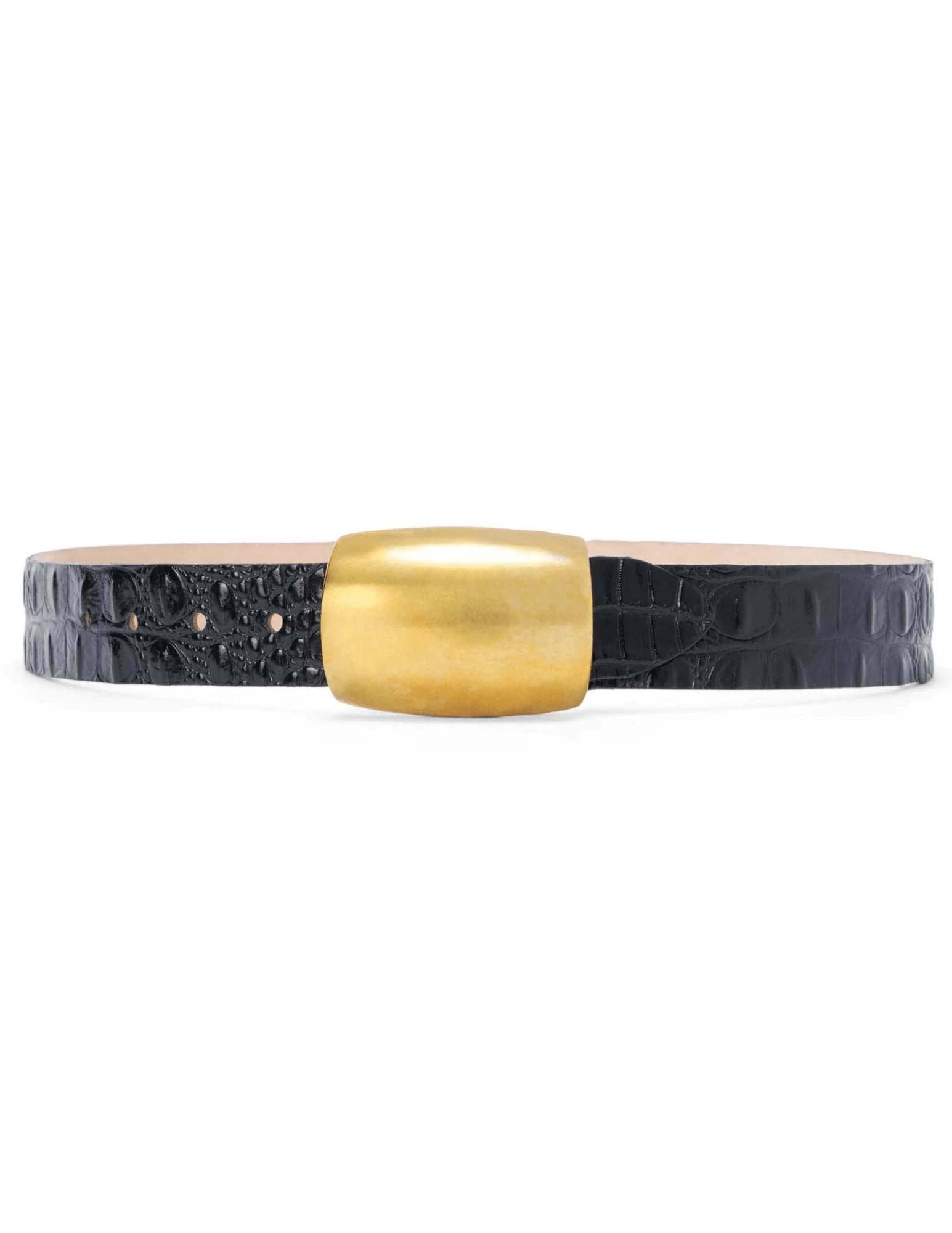 The L’AGENCE Milou Domed Buckle Belt is a striking statement accessory, handcrafted in partnership with renowned Los Angeles label Streets Ahead. Designed in rich black croc-embossed leather, this belt features a bold gold-plated dome-shaped buckle, blending sculptural elegance with artisanal craftsmanship.