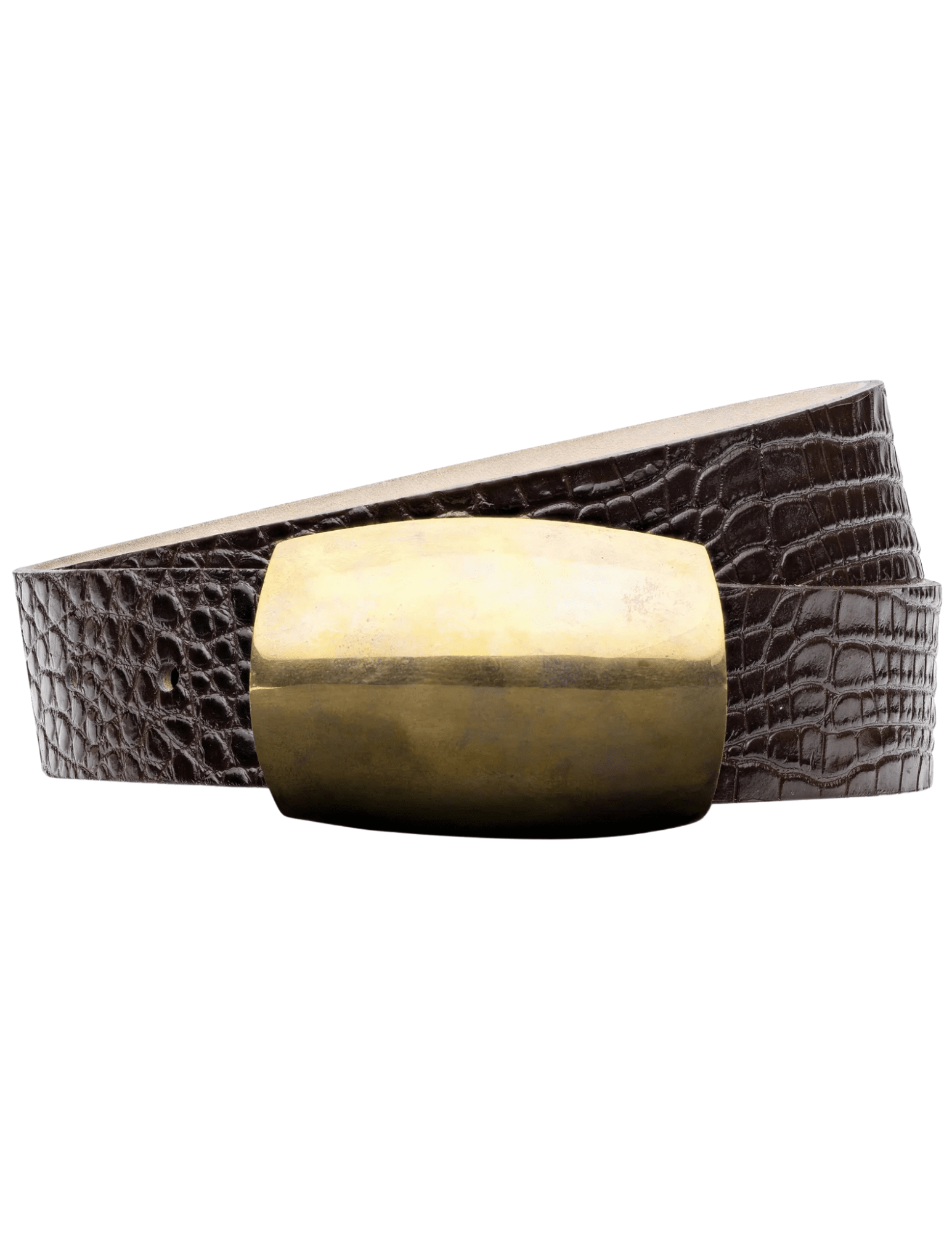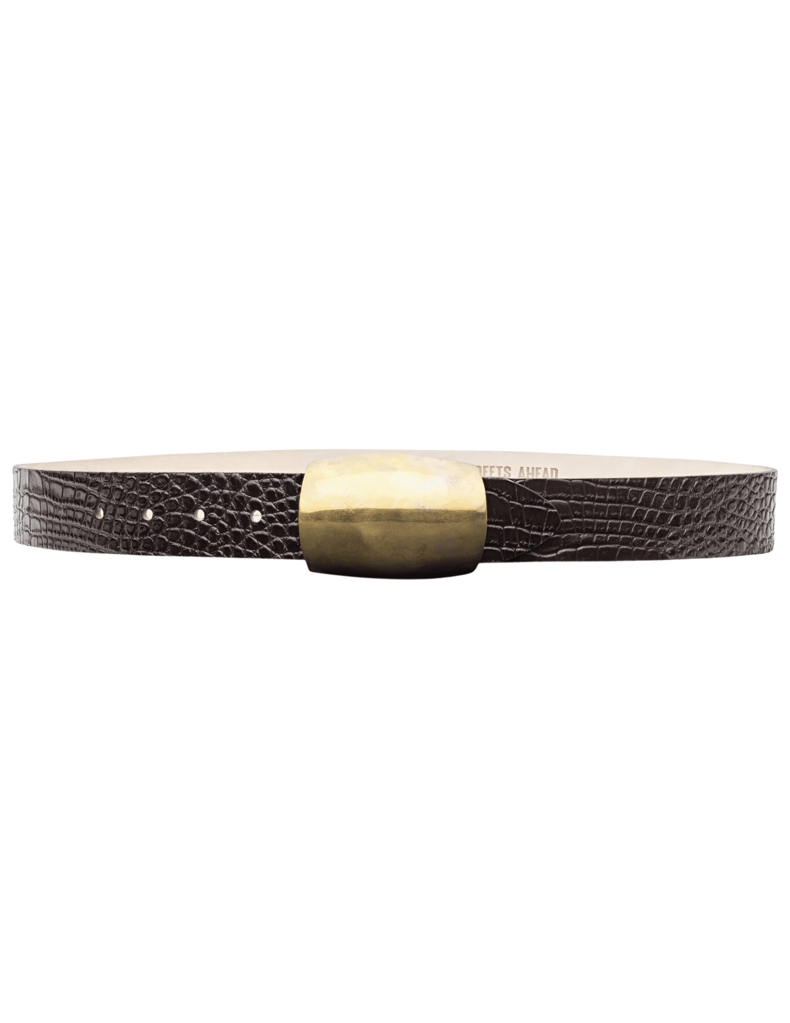 The L’AGENCE Milou Domed Buckle Belt is a striking statement accessory, handcrafted in partnership with renowned Los Angeles label Streets Ahead. Designed in rich chocolate croc-embossed leather, this belt features a bold gold-plated dome-shaped buckle, blending sculptural elegance with artisanal craftsmanship.