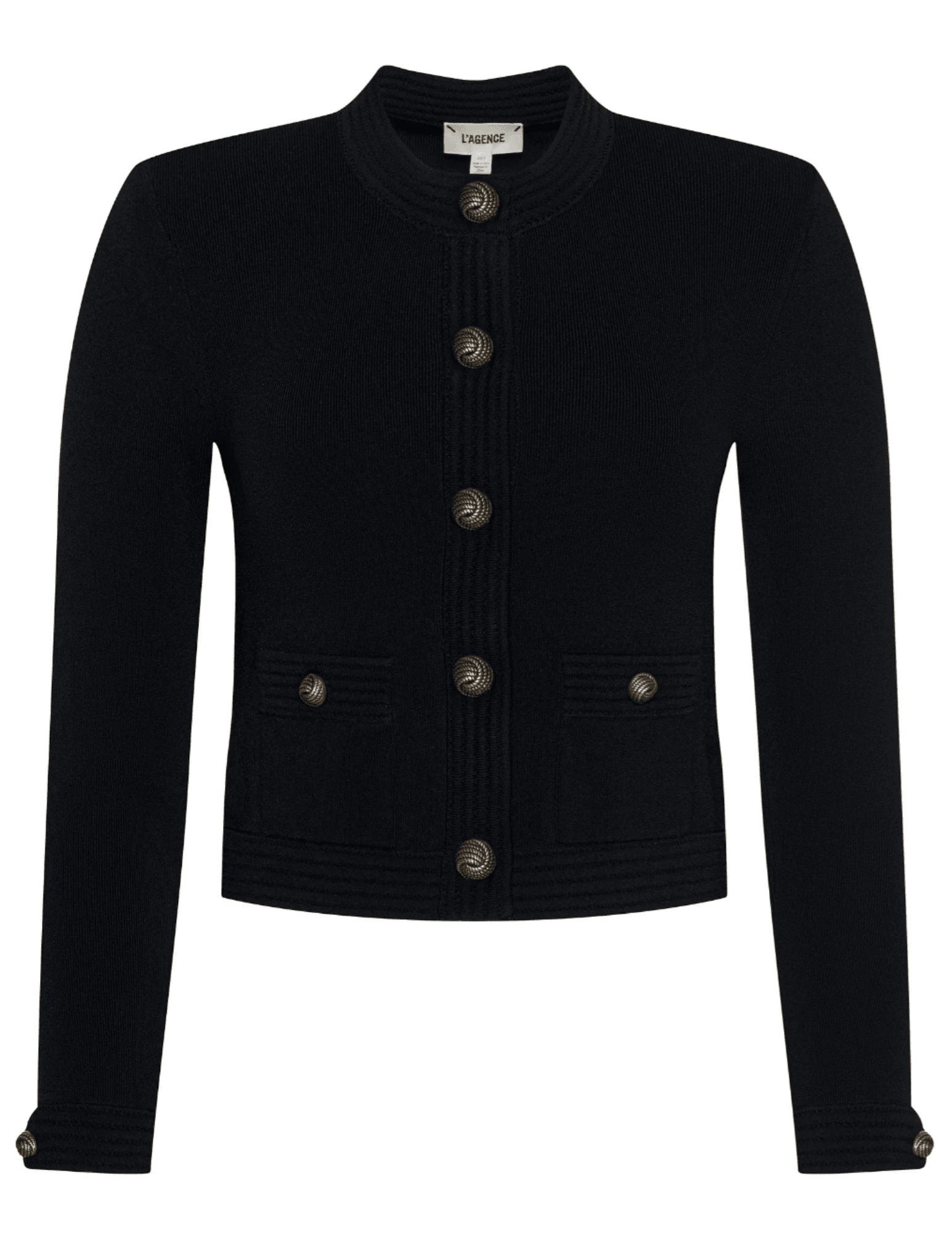 Crafted from a structured power knit, the Patsy offers both comfort and sleek shape retention. Ribbed trims add texture and structure, while patch pockets and shoulder pads lend a timeless, tailored appeal.