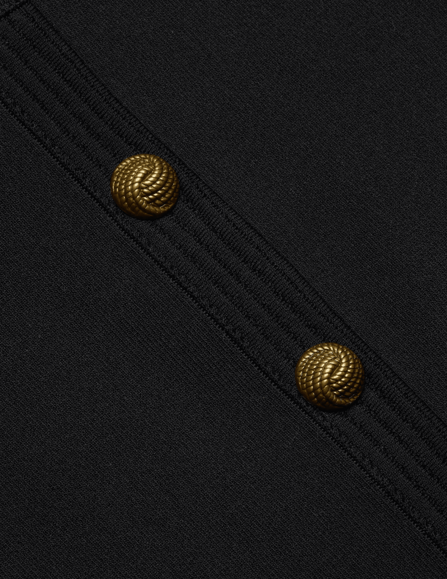 The Patsy Cropped Cardigan by L’AGENCE exudes sophisticated ease with a touch of Parisian polish. Designed in a Classic Black, this cropped silhouette features three-quarter sleeves, signature snap buttons, and ornate, gold-toned domes etched with a ridged spiral motif for a refined finish.