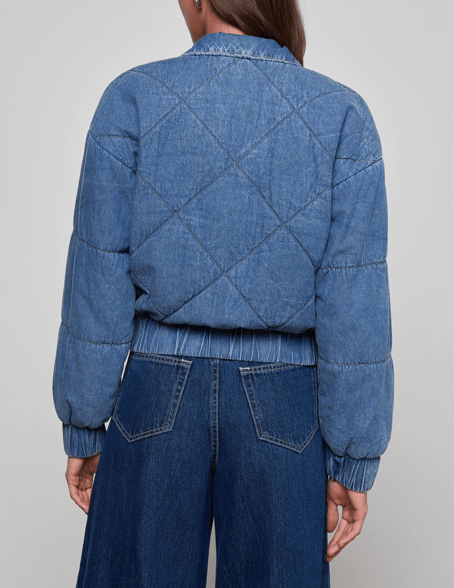 The L’AGENCE Ryah Washed Denim Bomber Jacket in medium wash denim redefines casual chic with a relaxed, contemporary silhouette. Crafted from 100% cotton washed denim, this quilted bomber delivers effortless layering with a luxe streetwear edge.