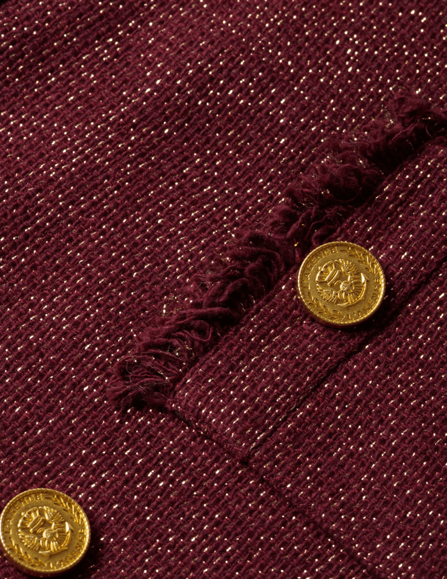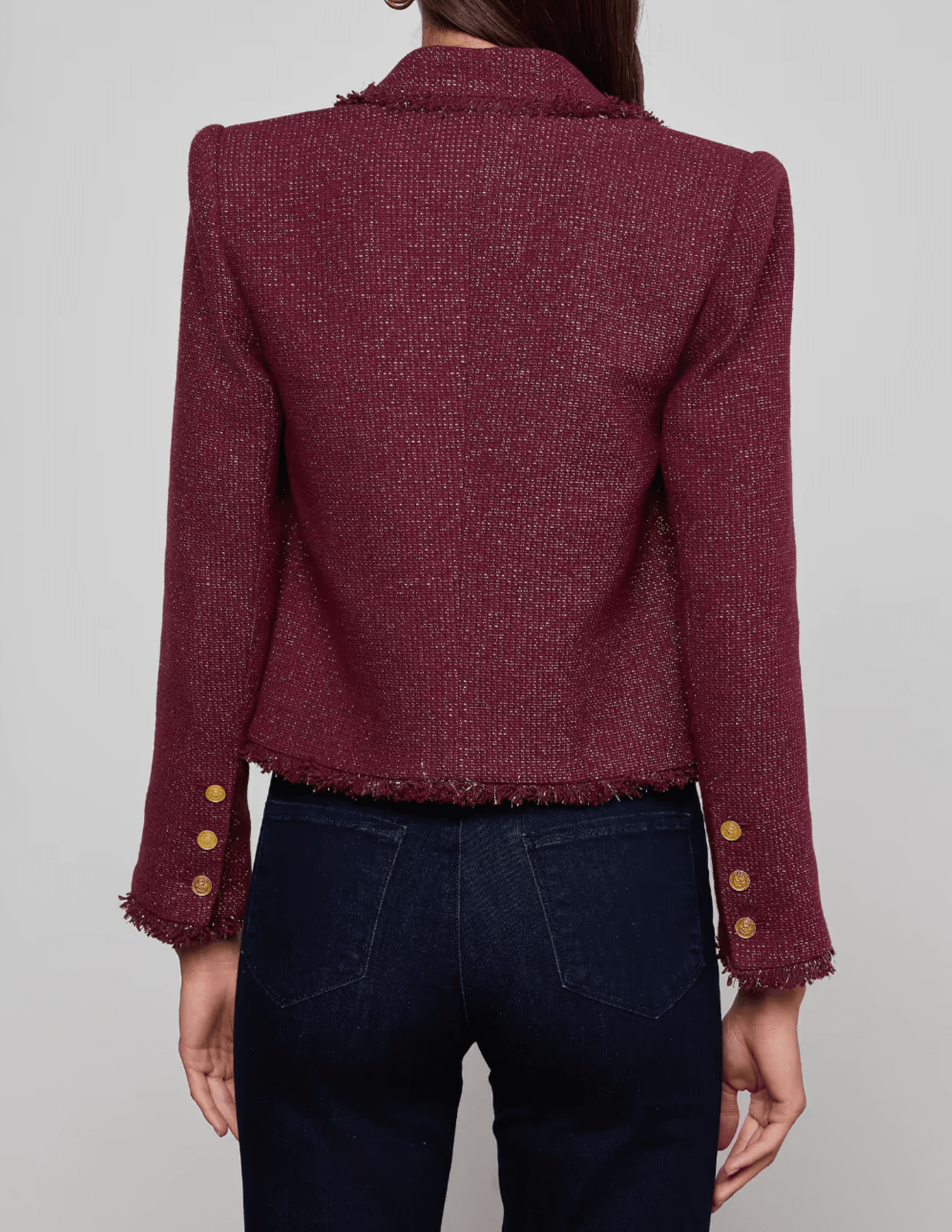 The L’AGENCE Sylvia Collared Fringe Hem Jacket in Malbec Gold is a striking blend of tailored sophistication and modern edge. Crafted in rich dark burgundy tweed with subtle fringe hem detailing, this structured blazer features strong shoulders and luxe gold dome embossed buttons for a bold statement.