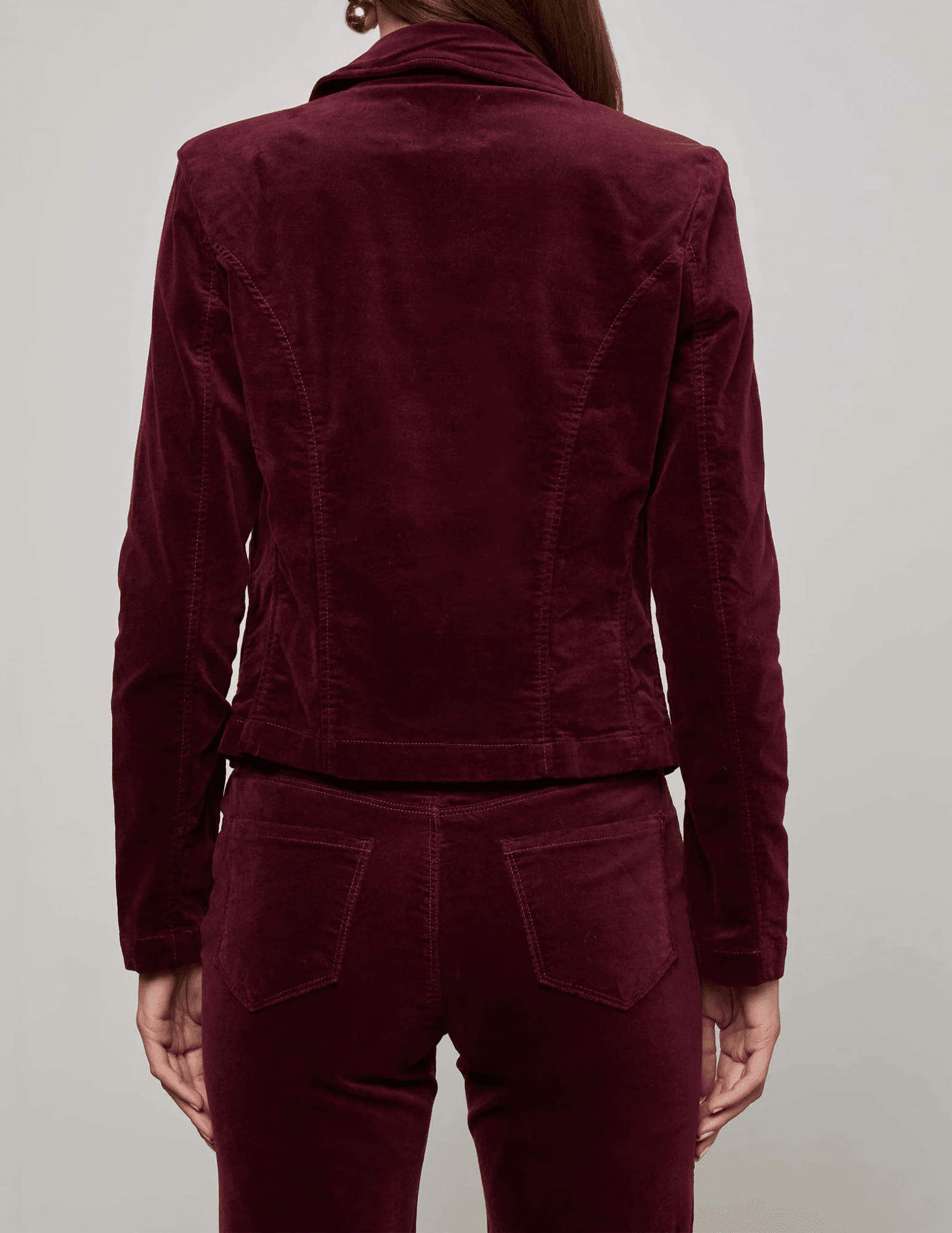 The L’AGENCE Wayne Blazer redefines modern tailoring through the lens of Parisian polish and Los Angeles ease. Crafted from plush stretch velvet, this cropped double-breasted blazer sculpts the figure with strong shoulders and tapered seaming that accentuates the waist.