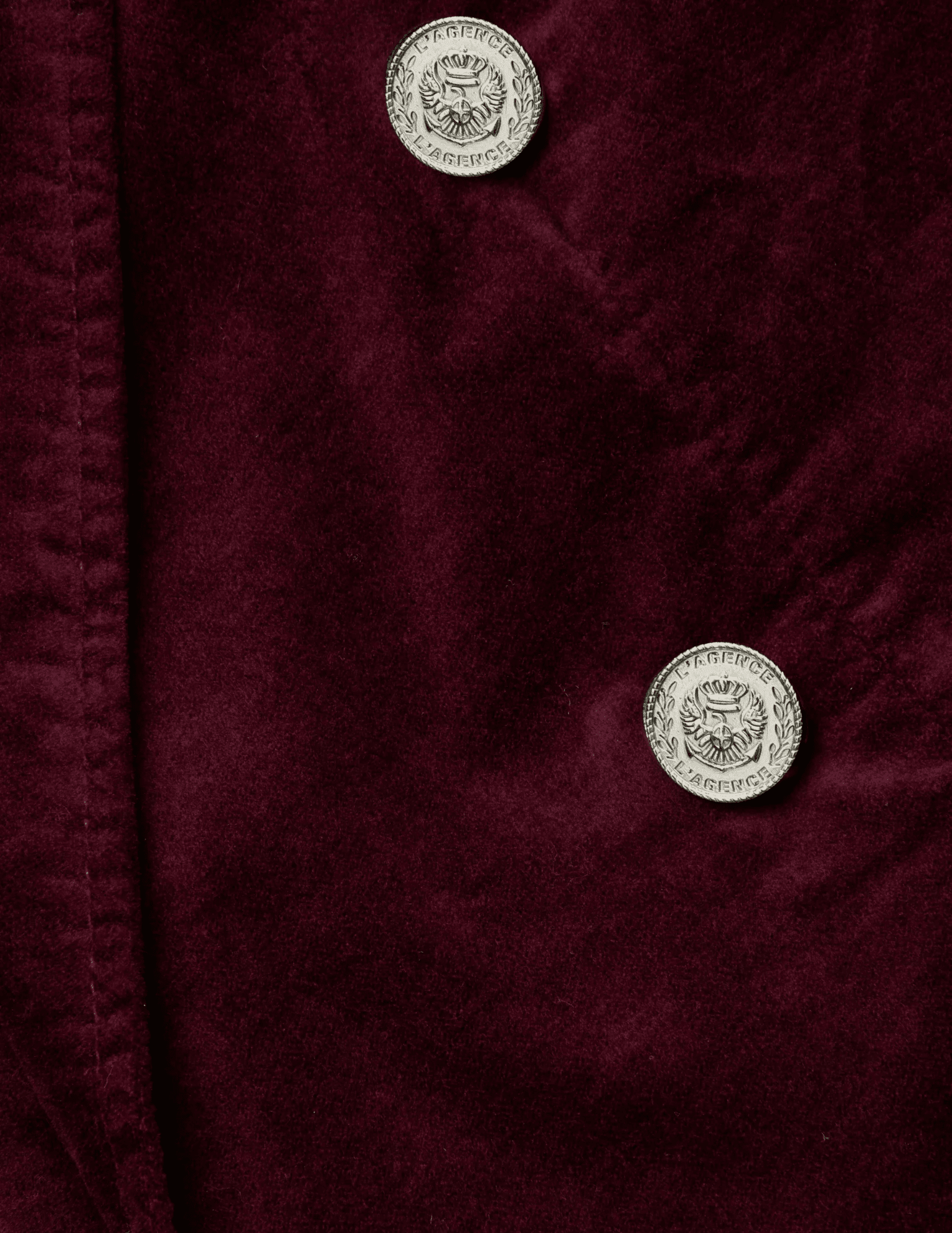 The Dark Port hue — a rich burgundy tone — adds depth and sophistication, while silver embossed-dome buttons elevate the look with subtle edge. Finished with peaked lapels and sartorial structure, this velvet blazer is both timeless and distinctly statement-making.