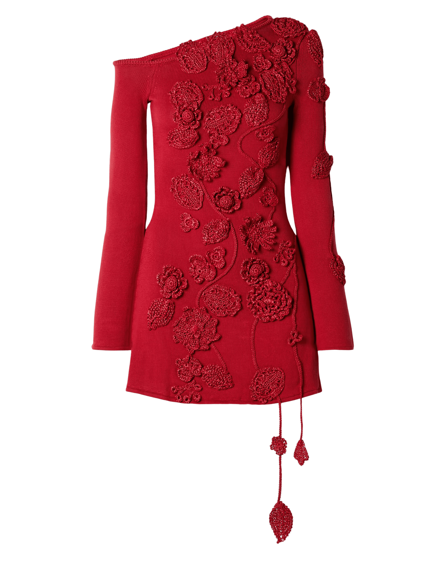 The Kaela Knit Mini Dress from Cult Gaia is a true work of art — sculptural, romantic, and effortlessly striking. Crafted in a rich merlot red hue, this statement piece features hand-crocheted appliqué 3D floral detailing that creates texture and dimension across its asymmetrical, off-shoulder neckline.