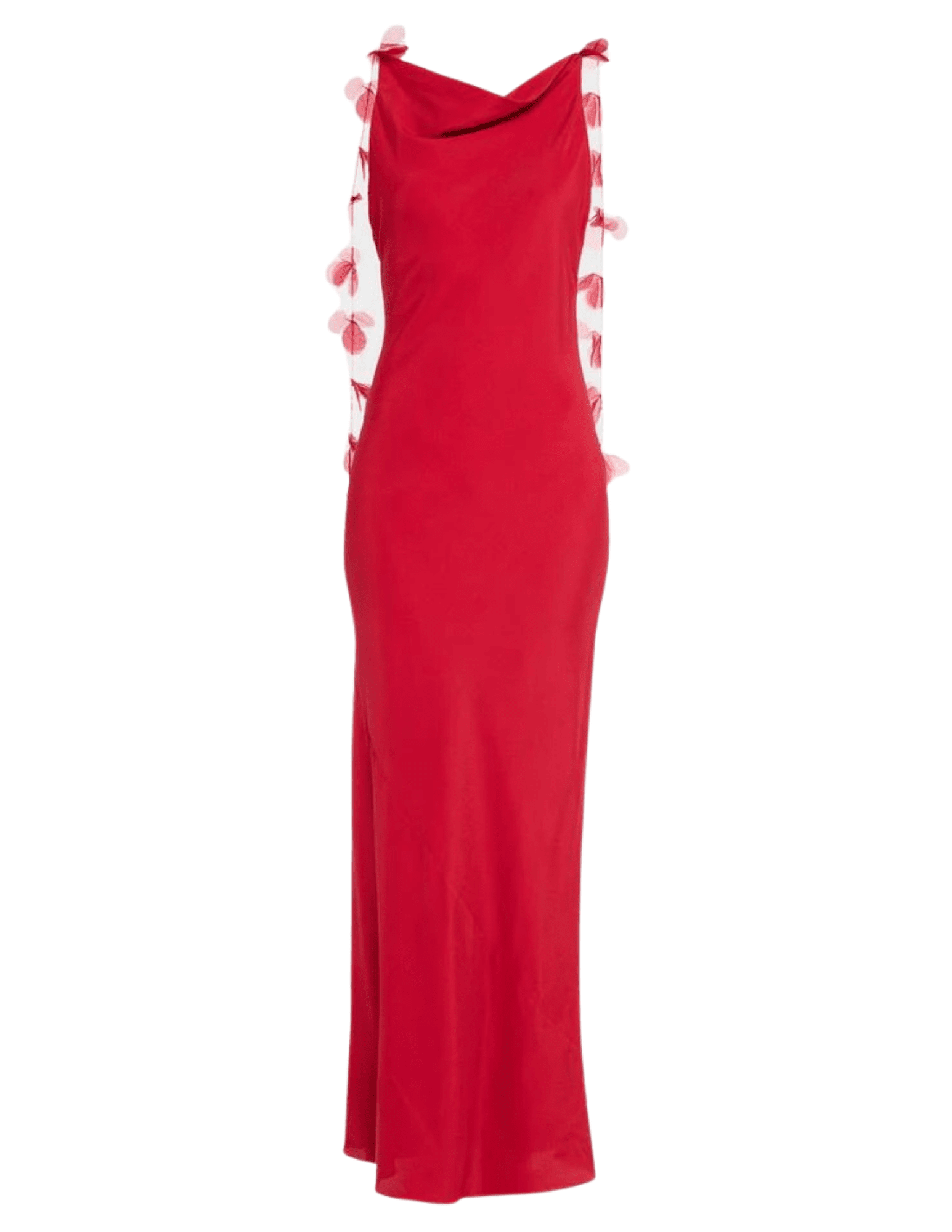 The gown’s defining detail — handcrafted silk organza flower petals — cascades gracefully along the shoulders and spine, accented with delicate beadwork that shimmers with every movement. Crafted from matte air satin silk, this piece embodies modern glamour with signature Cult Gaia artistry.