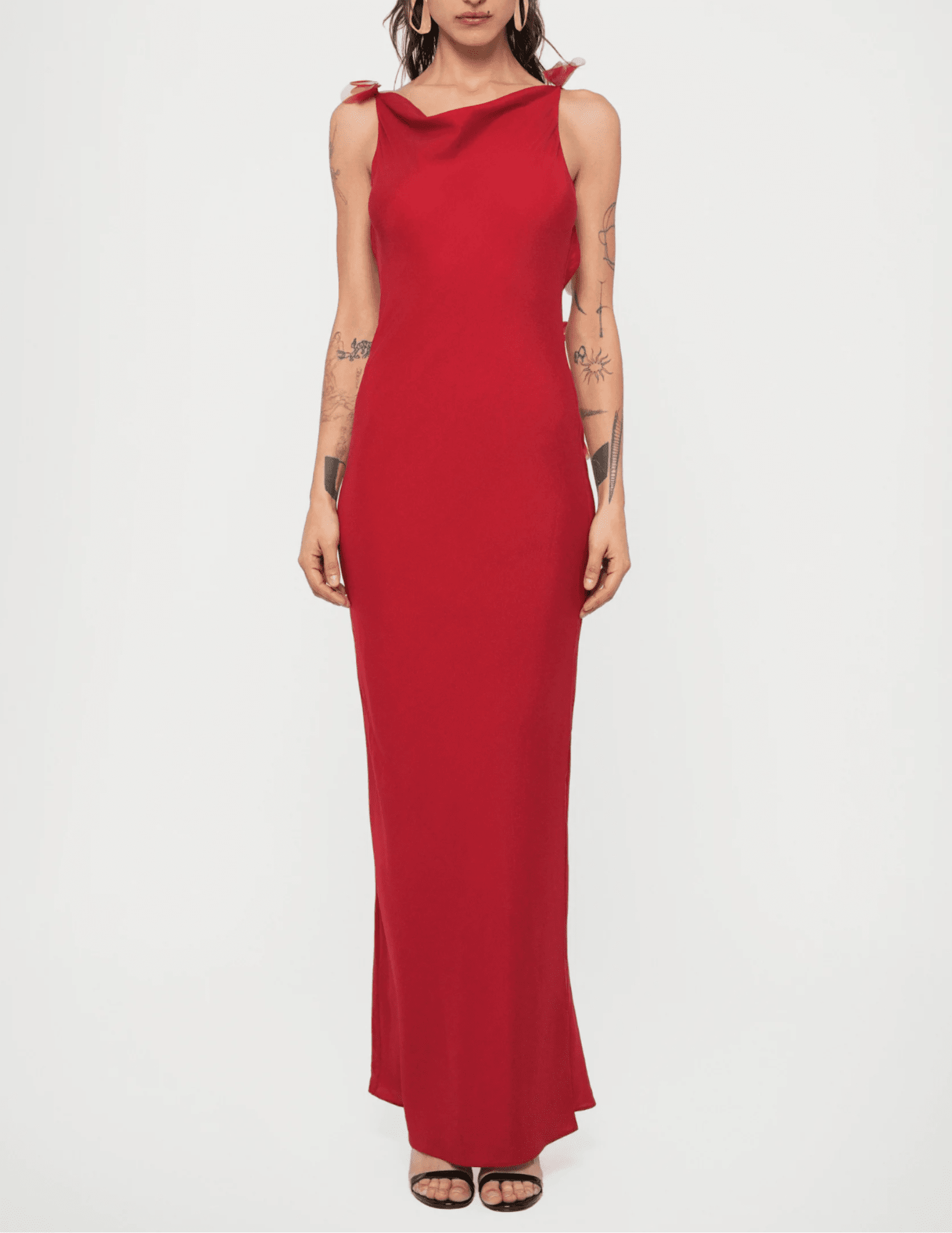 The Nymeria Gown by Cult Gaia is a breathtaking statement in sculptural elegance. Designed in a rich merlot silk satin, this maxi-length gown features a subtle cowl neckline and a dramatic open back, creating a balance of sophistication and allure.