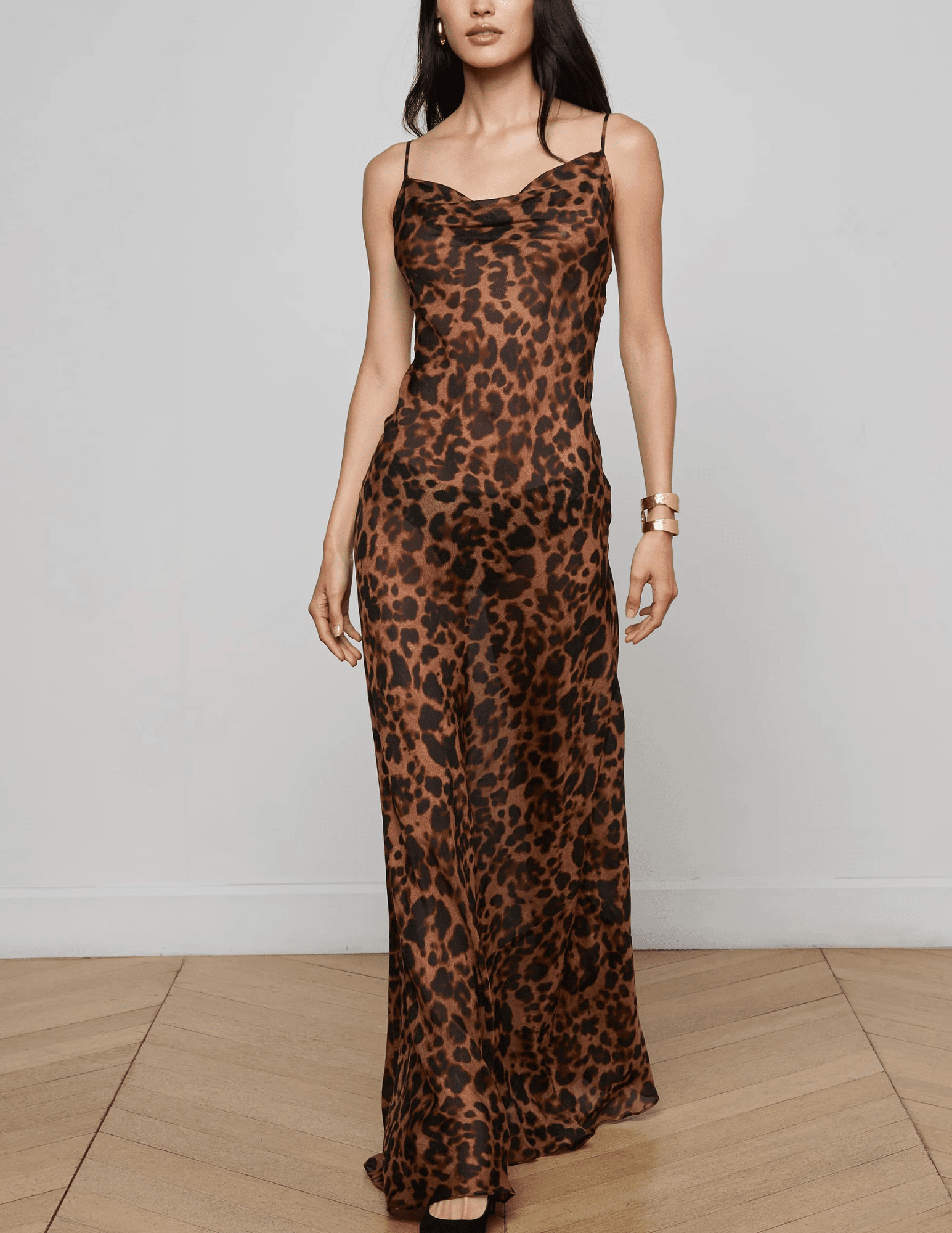 A cowl neckline adds a touch of understated elegance, while adjustable spaghetti straps ensure a customized fit. The brown leopard print delivers bold sophistication, making this maxi dress a standout piece in any wardrobe. Unlined and closure-free, it embodies effortless ease and modern sensuality.