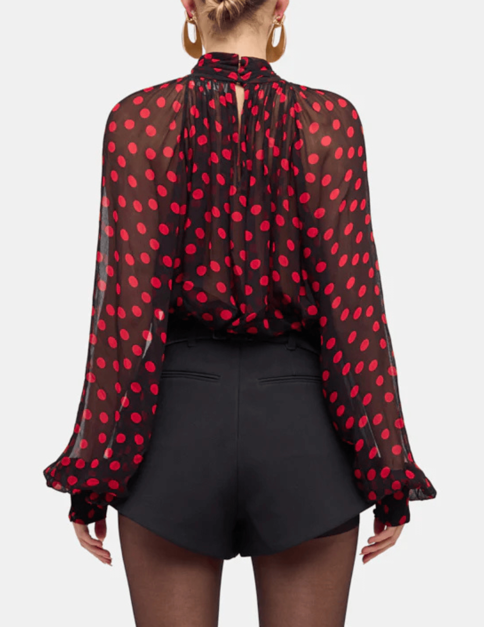 The Zania Top by Ronny Kobo blends timeless femininity with a bold, contemporary edge. Crafted from semi-sheer polka dot viscose, this statement blouse features romantic blouson sleeves, a high neckline, and a self-tie neck bow that adds a touch of sophisticated drama.