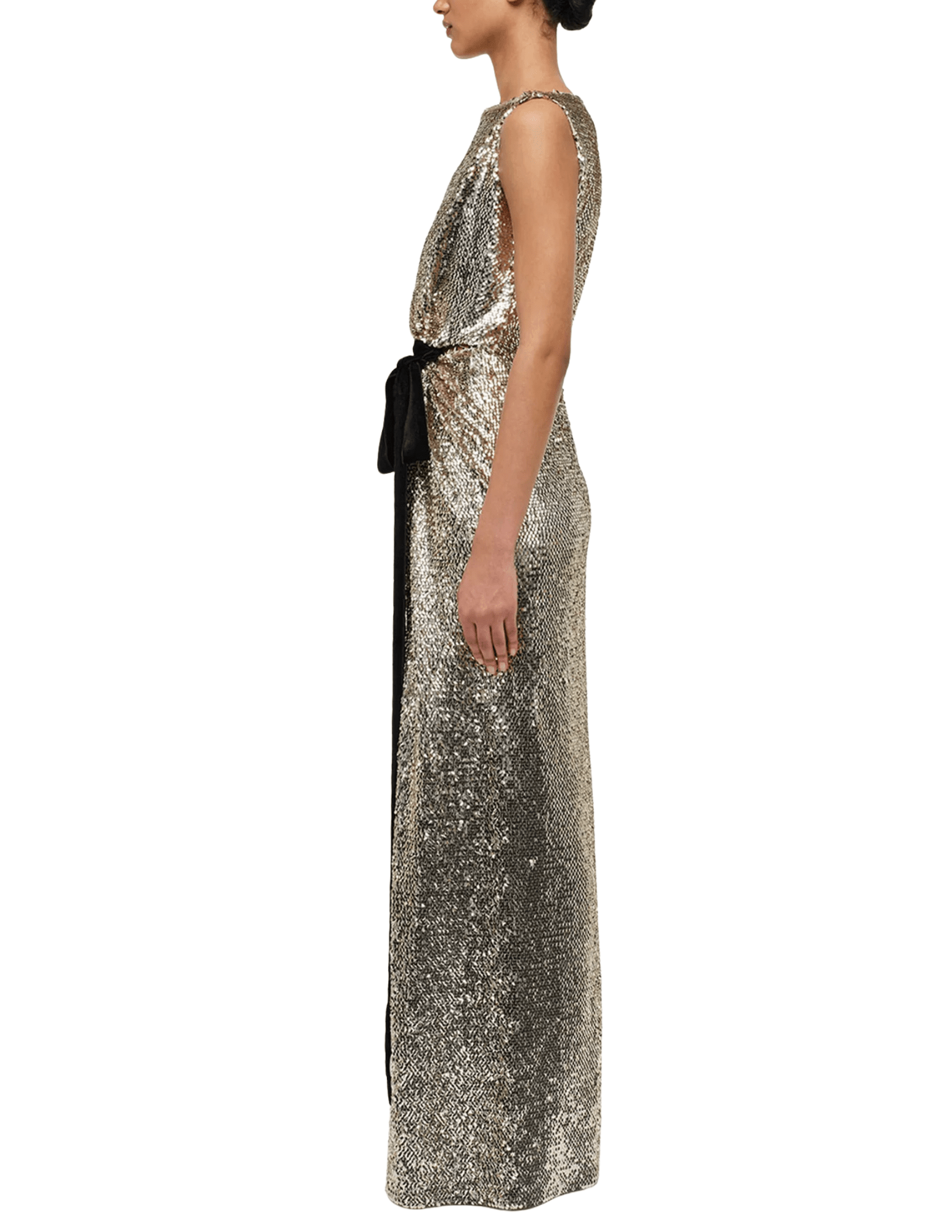Simkhai Felicity Draped Sequined Gown in gold multi.